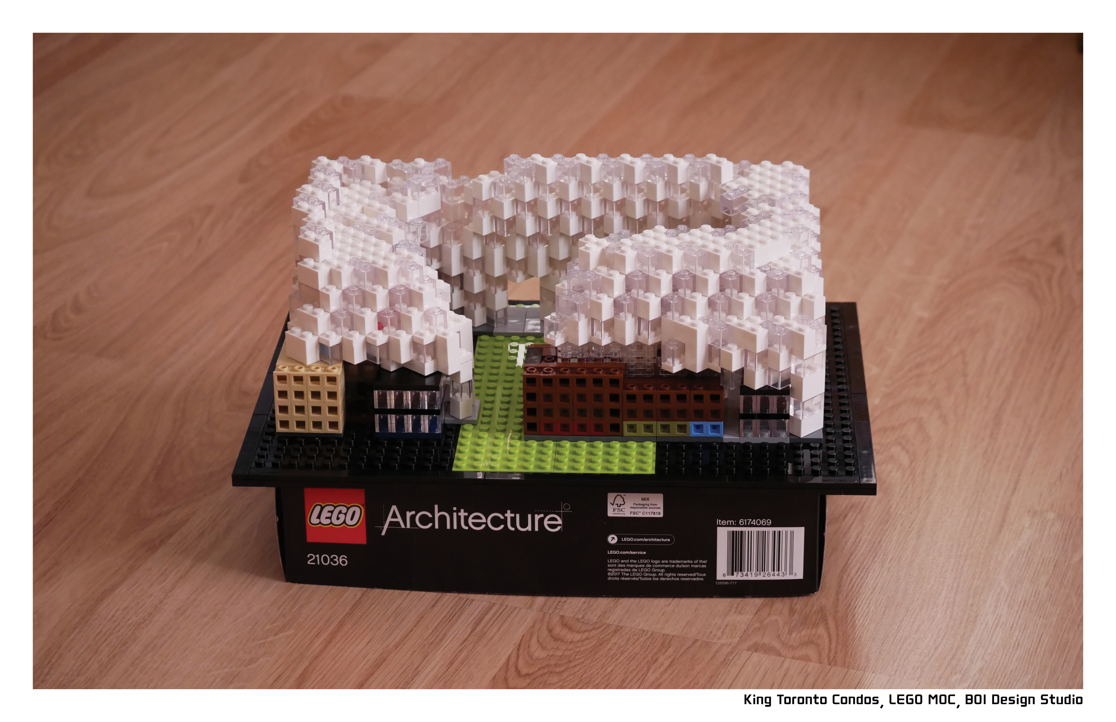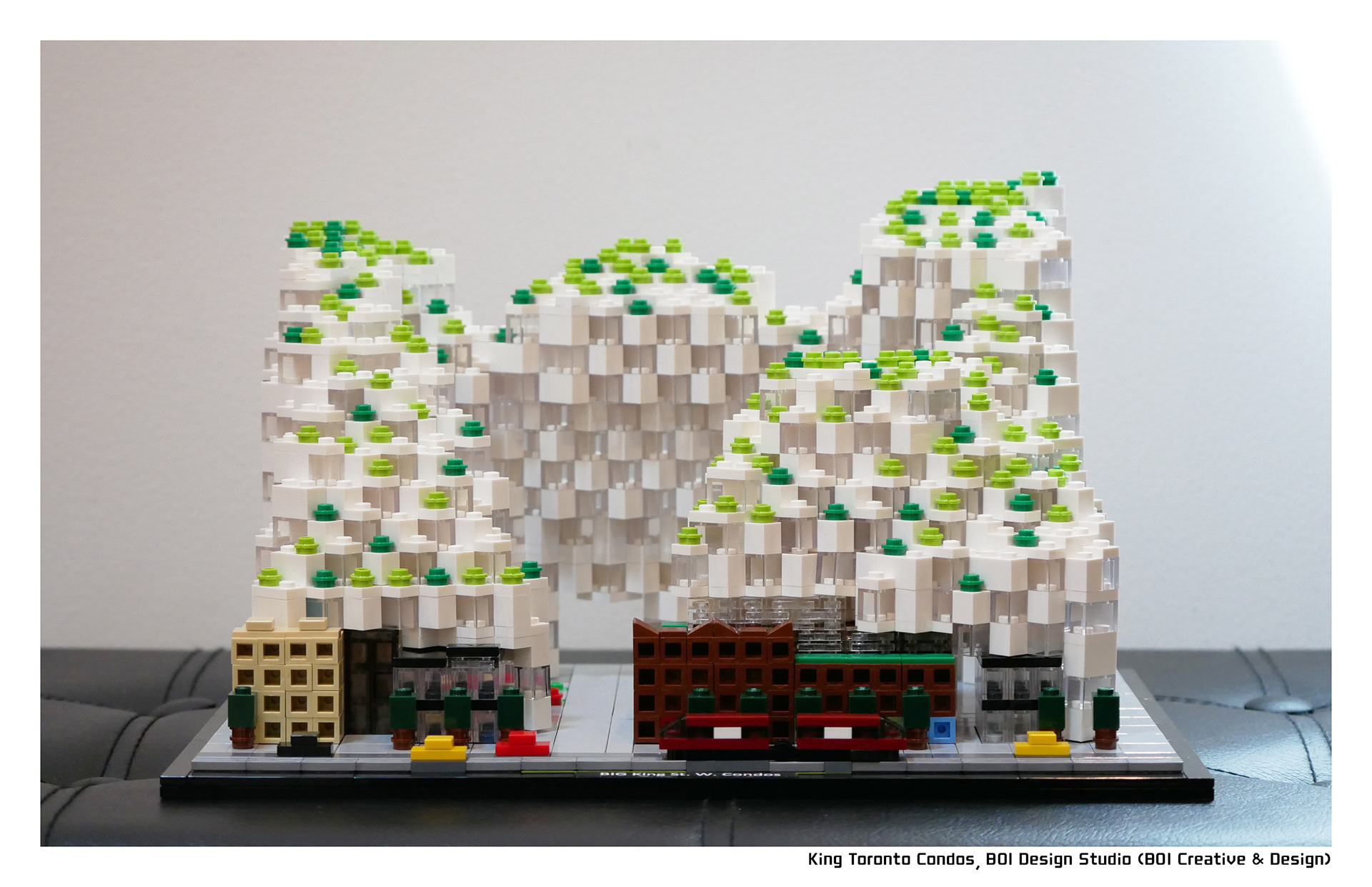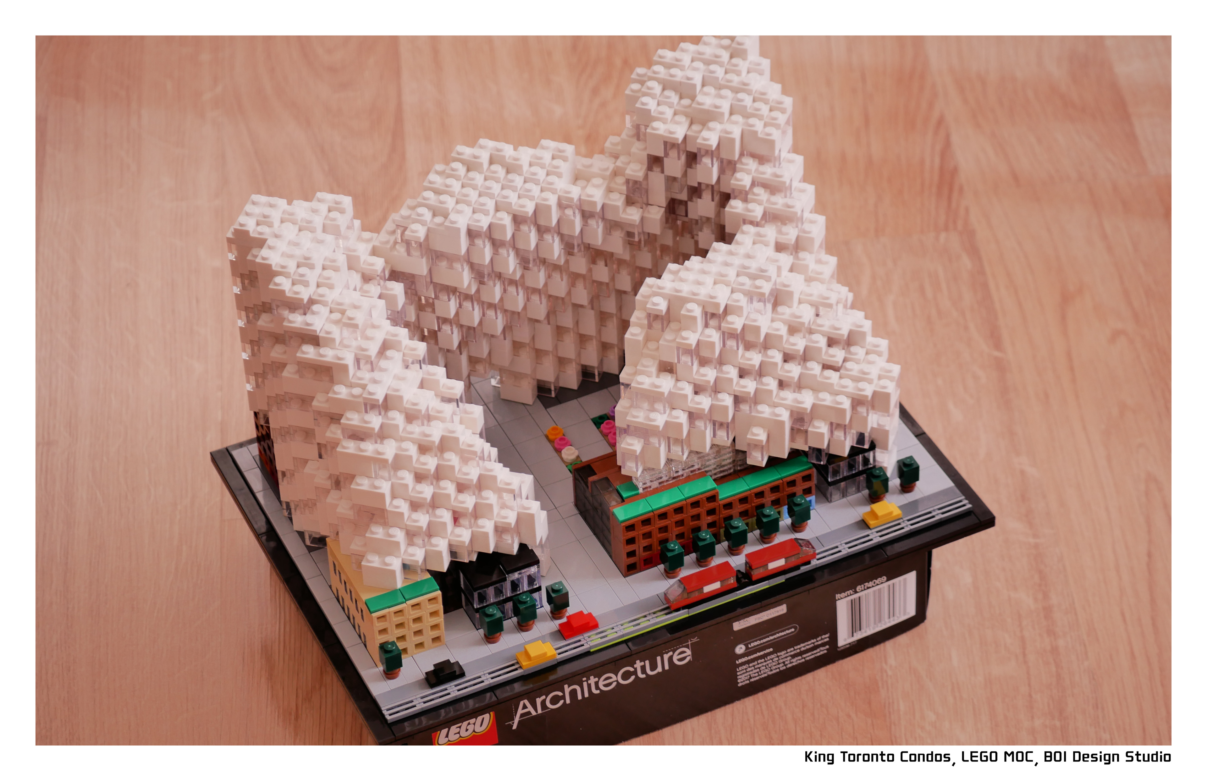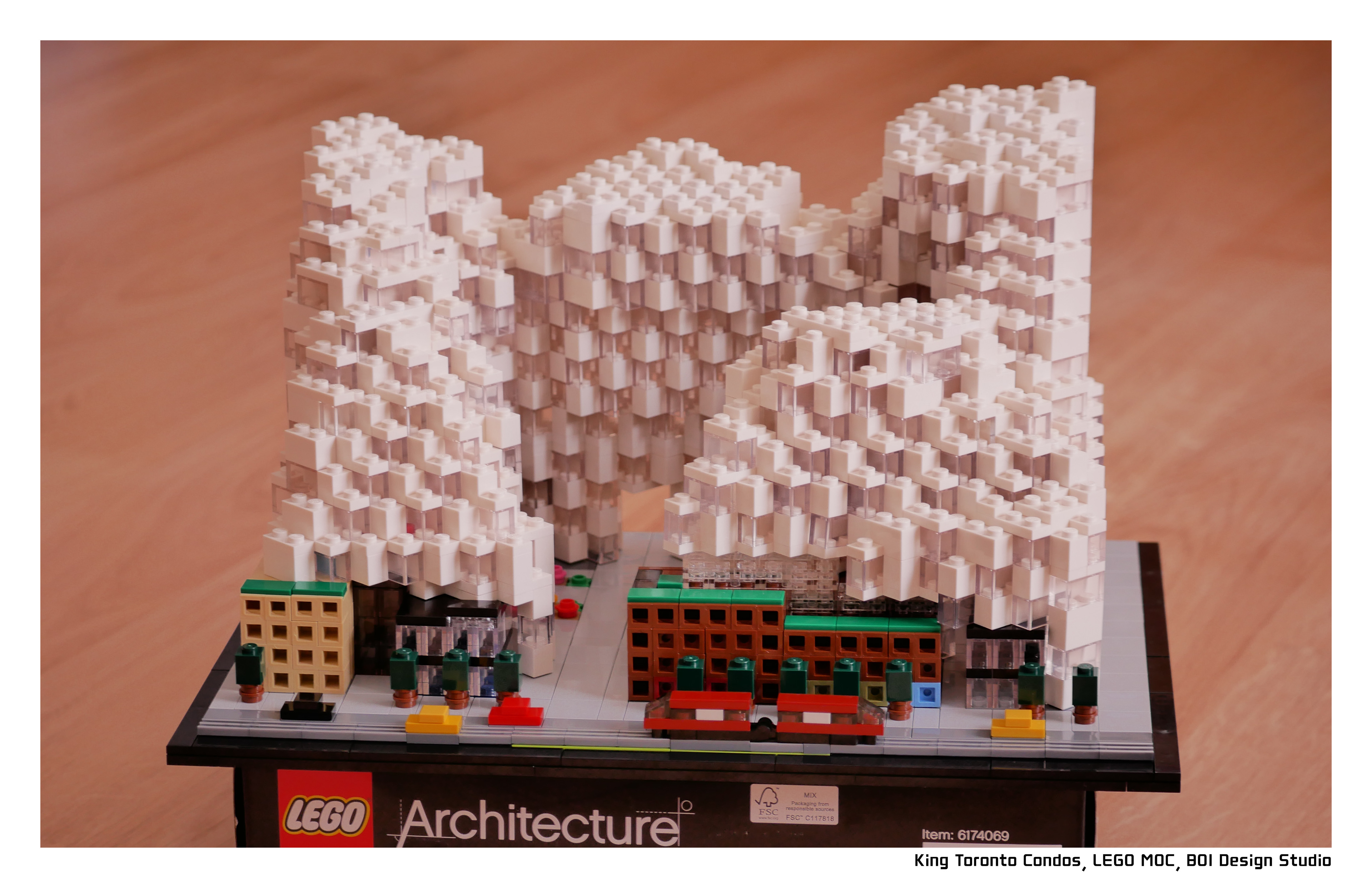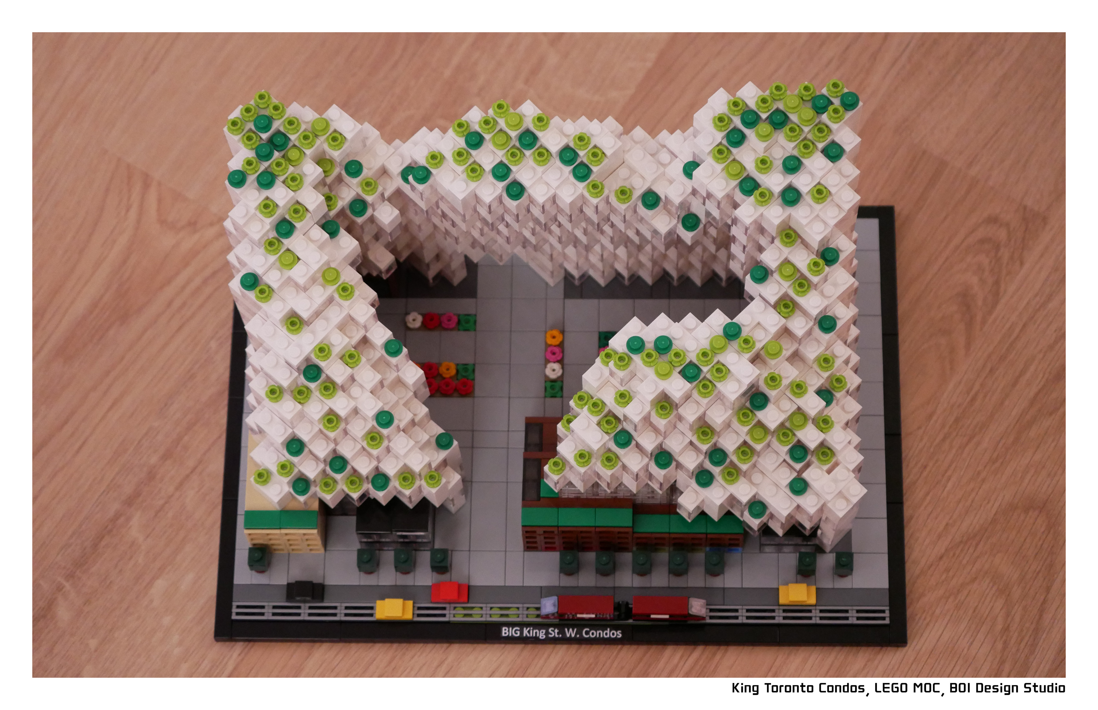 In 2020, BOI Design Team’s LEGO MOC (My Own Creation) model of 285060 King West Street Condos (King Toronto Condos) is a compelling and articulate miniature architectural representation that demonstrates both form literacy and conceptual clarity in a playful medium by BIG (Bjarke Ingels Group). The stepped geometry, even at LEGO scale, communicates ideas of urban porosity, private terraces, and dynamic skyline modulation. Despite the limitations of the LEGO brick system, the designer skillfully uses block texture, color contrast, and modular stacking to express façade articulation, horizontal bands, and spatial variation, effectively conveying architectural hierarchy. The model isn’t just a miniature of a building — it demonstrates a clear understanding of urban context and typology, possibly referencing King West’s evolving condo landscape in Toronto. It reads as a model not just of form, but of function and program, suggesting zones for commercial base levels, stepped mid-rise residences, and rooftop terraces.
