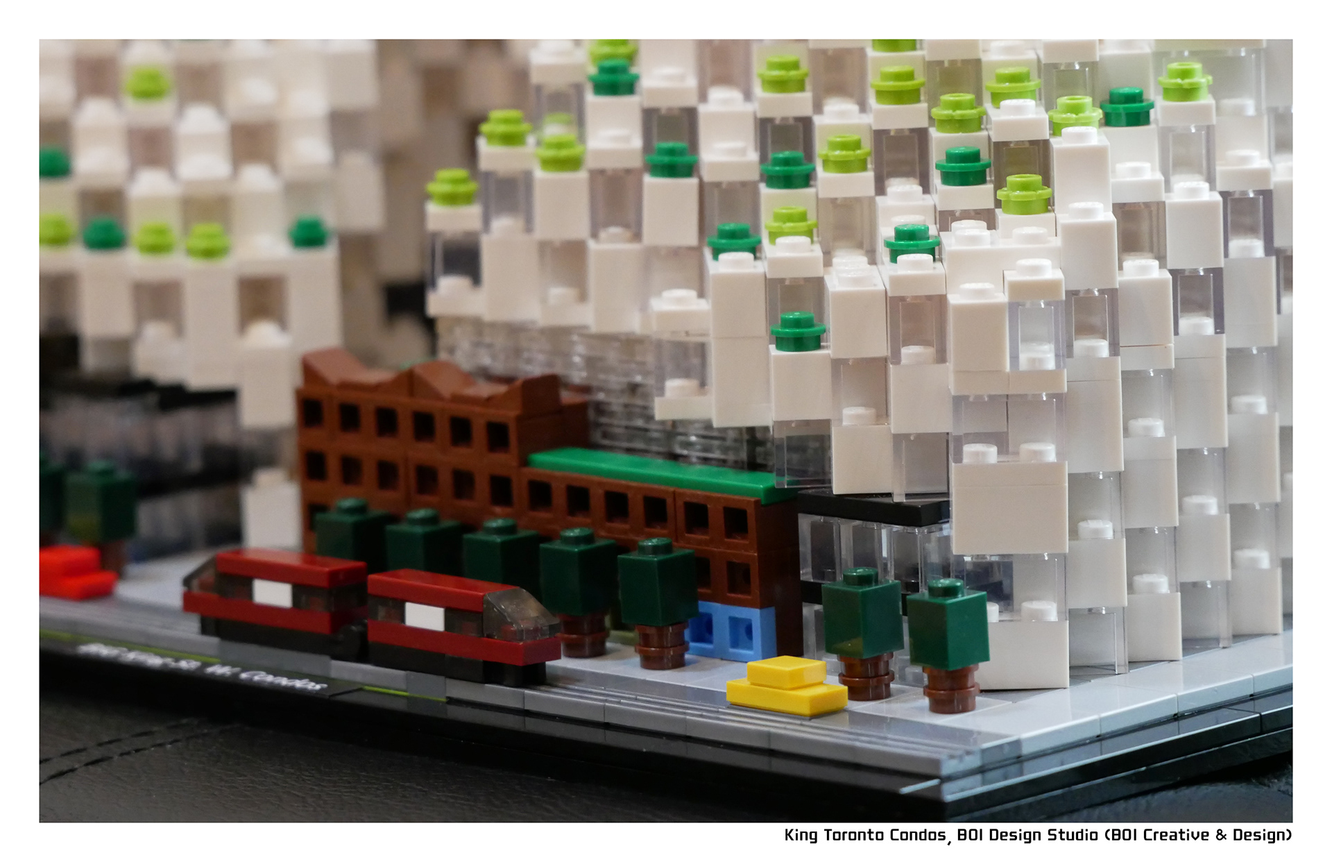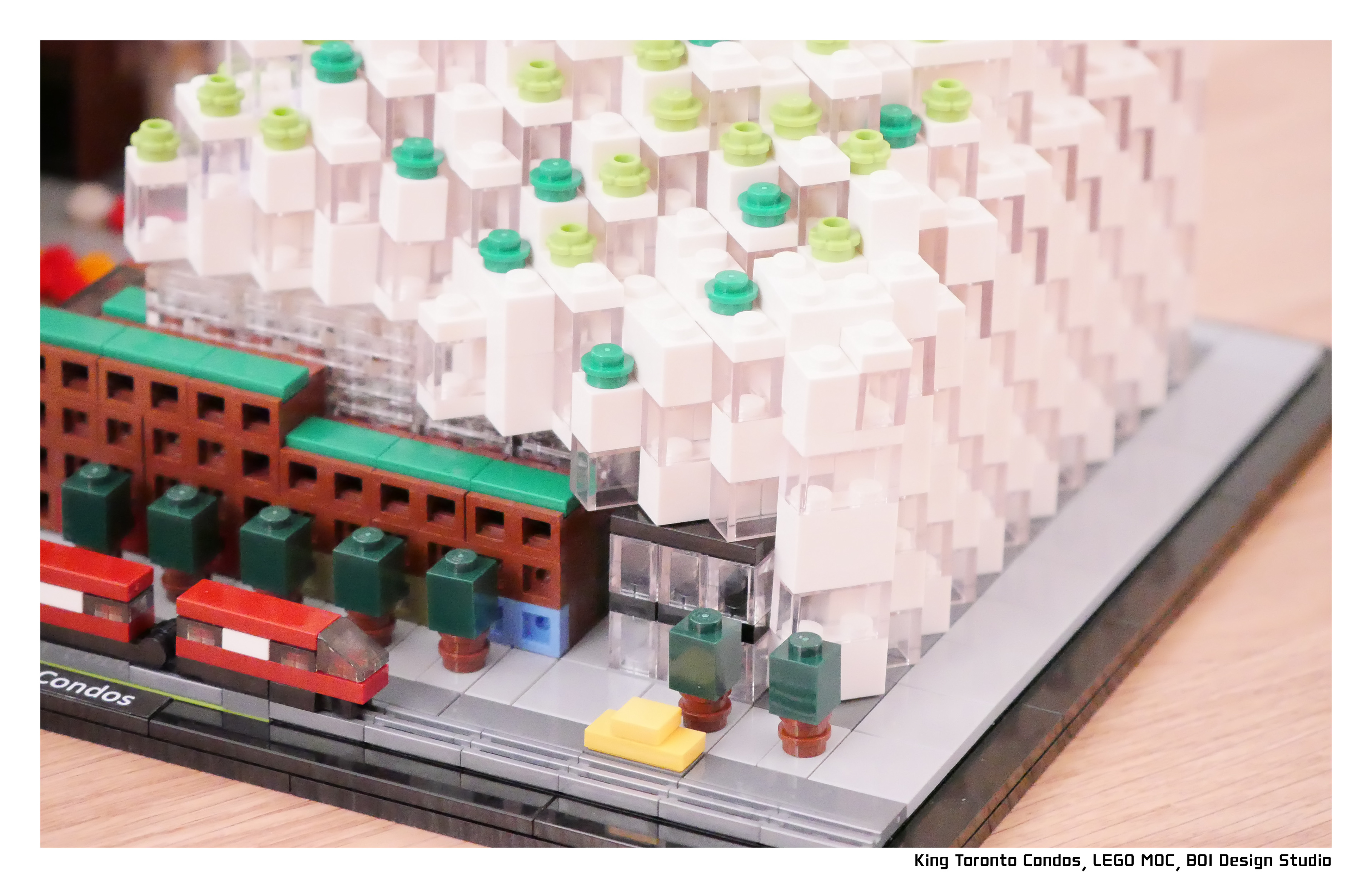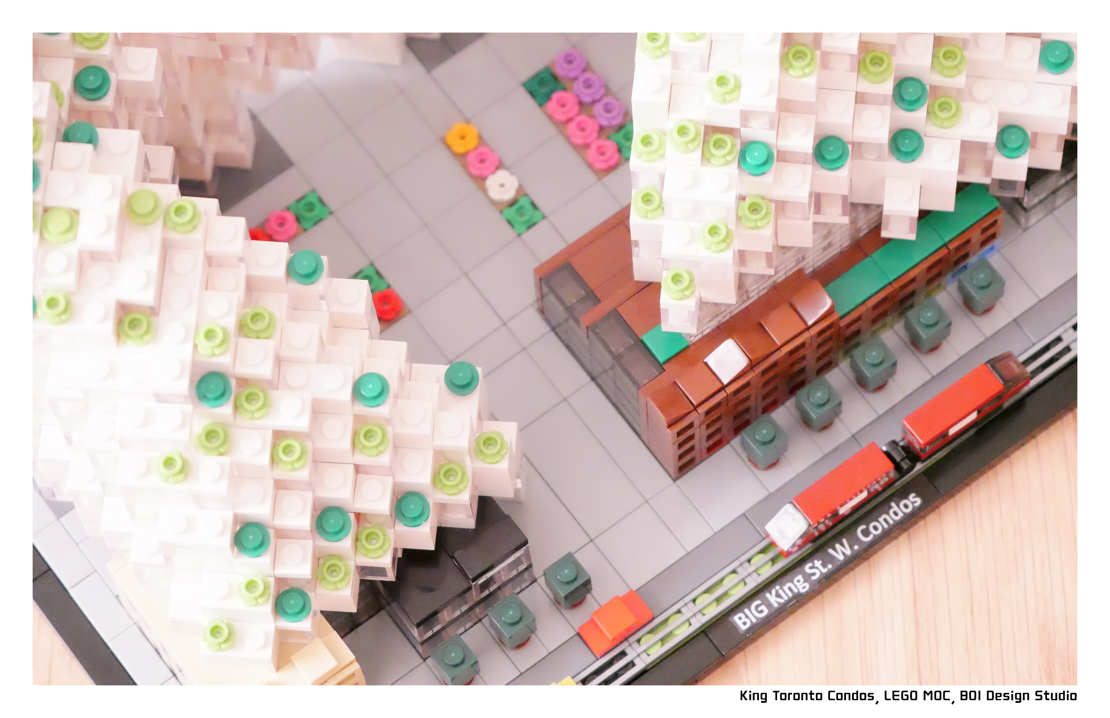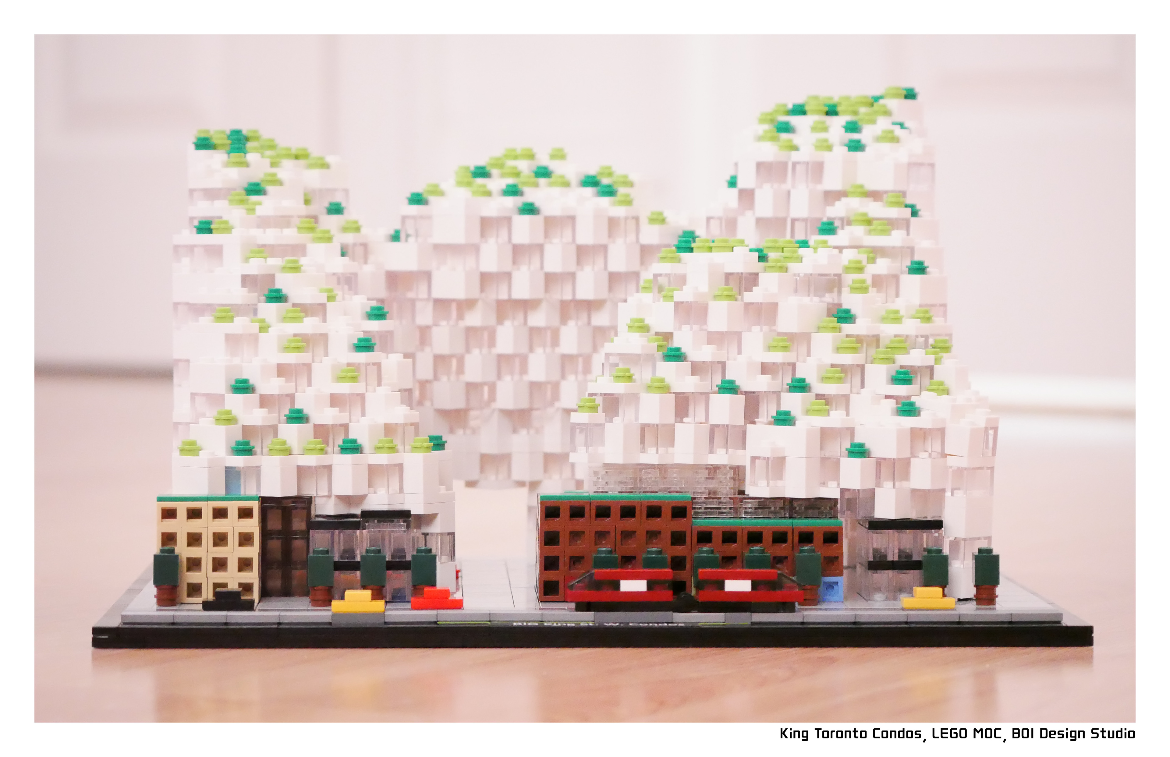 In 2020, BOI Design Team’s LEGO MOC (My Own Creation) model of 285060 King West Street Condos (King Toronto Condos) is a compelling and articulate miniature architectural representation that demonstrates both form literacy and conceptual clarity in a playful medium by BIG (Bjarke Ingels Group). The stepped geometry, even at LEGO scale, communicates ideas of urban porosity, private terraces, and dynamic skyline modulation. Despite the limitations of the LEGO brick system, the designer skillfully uses block texture, color contrast, and modular stacking to express façade articulation, horizontal bands, and spatial variation, effectively conveying architectural hierarchy. The model isn’t just a miniature of a building — it demonstrates a clear understanding of urban context and typology, possibly referencing King West’s evolving condo landscape in Toronto. It reads as a model not just of form, but of function and program, suggesting zones for commercial base levels, stepped mid-rise residences, and rooftop terraces.