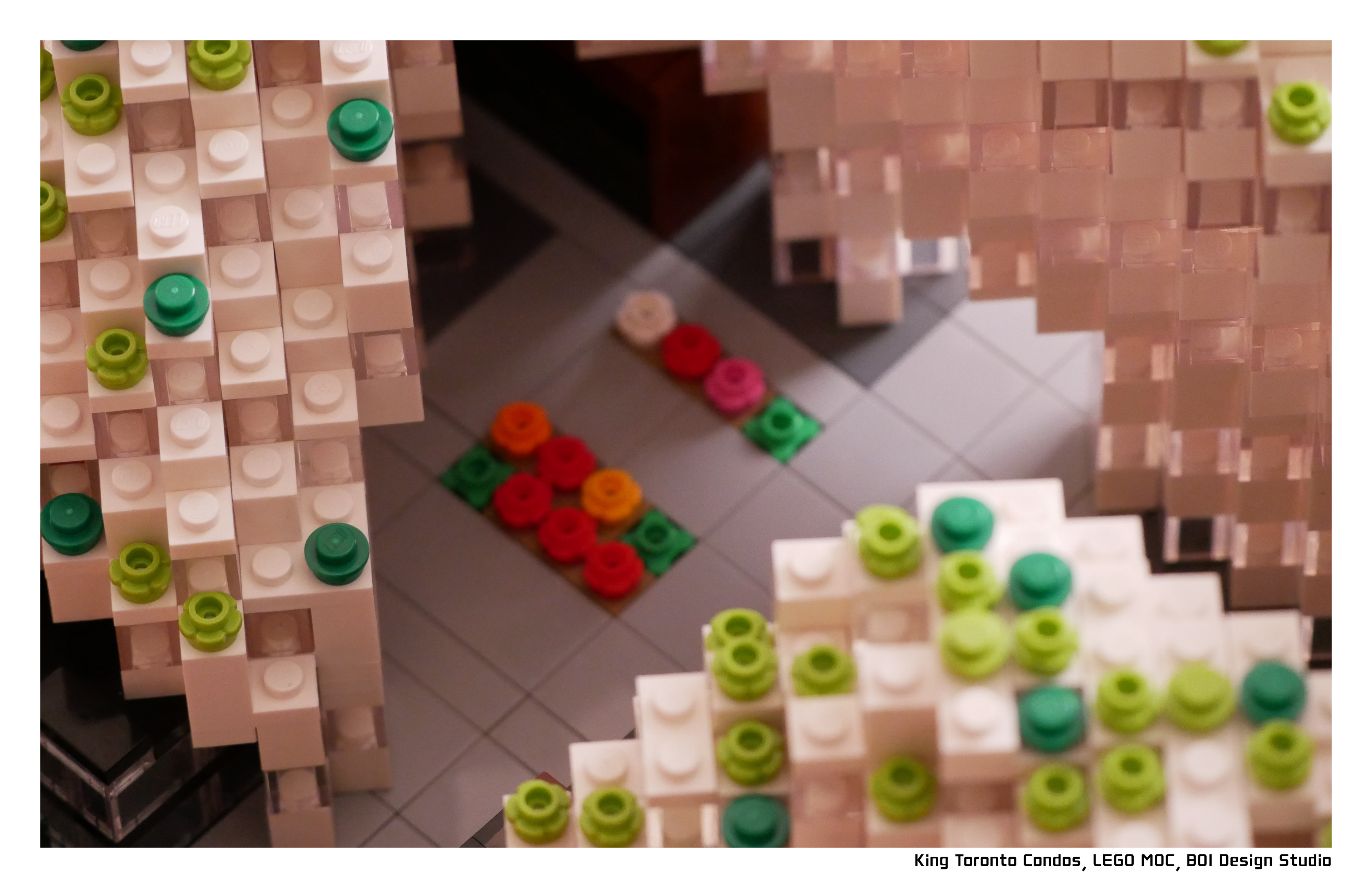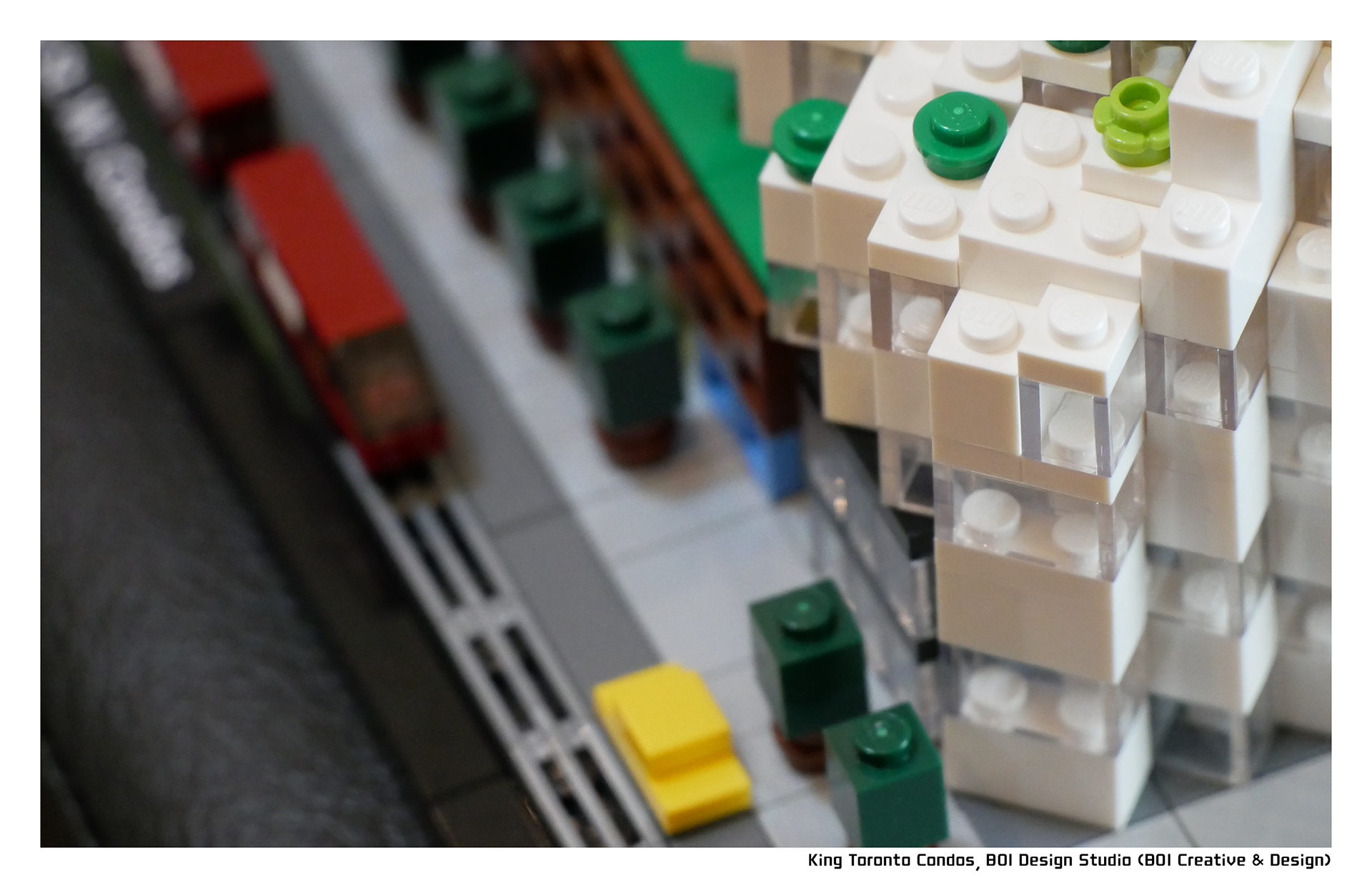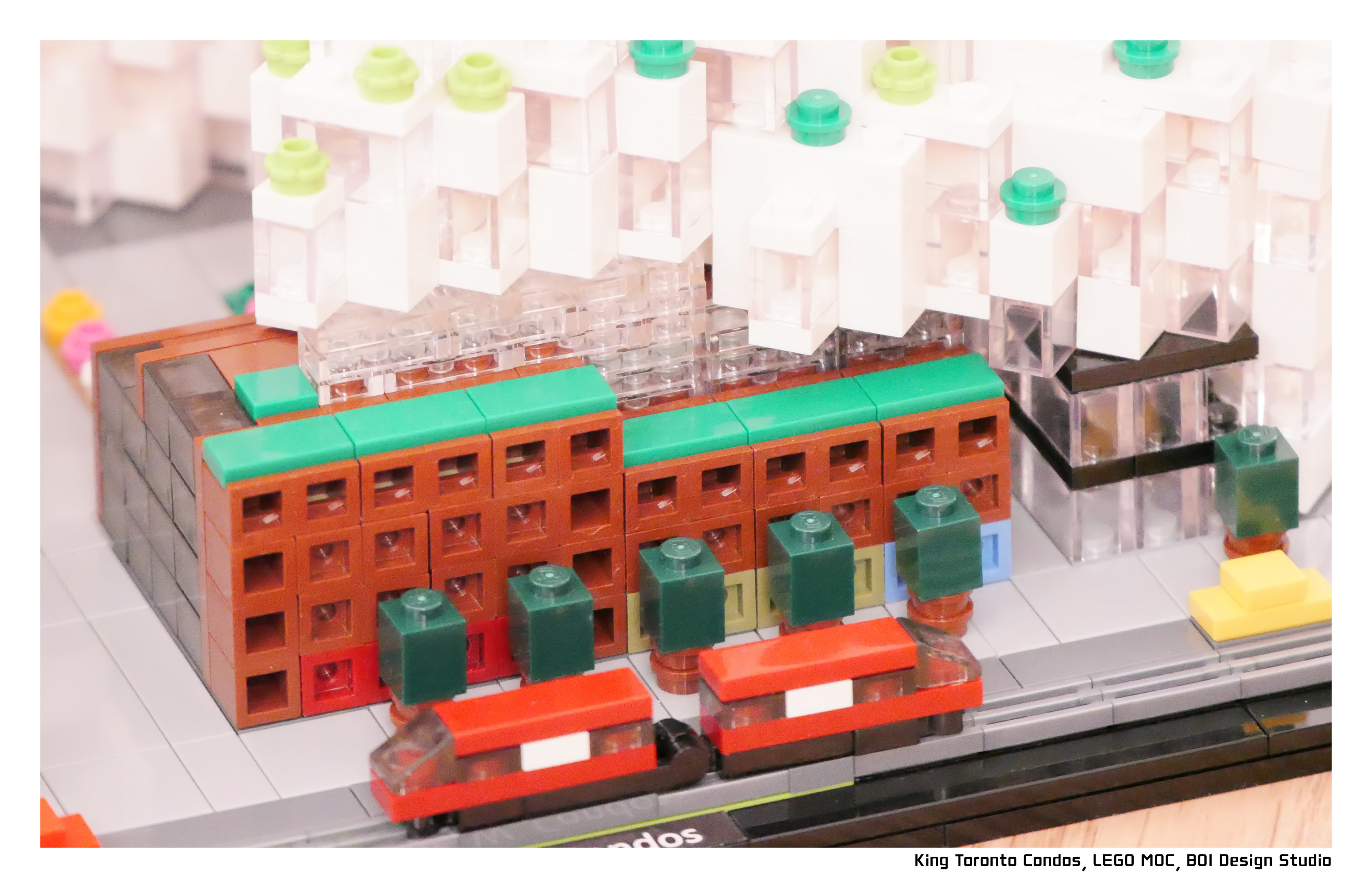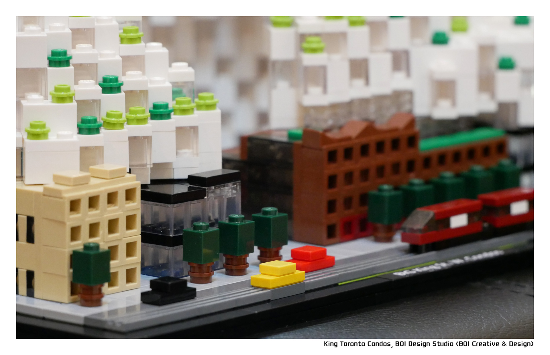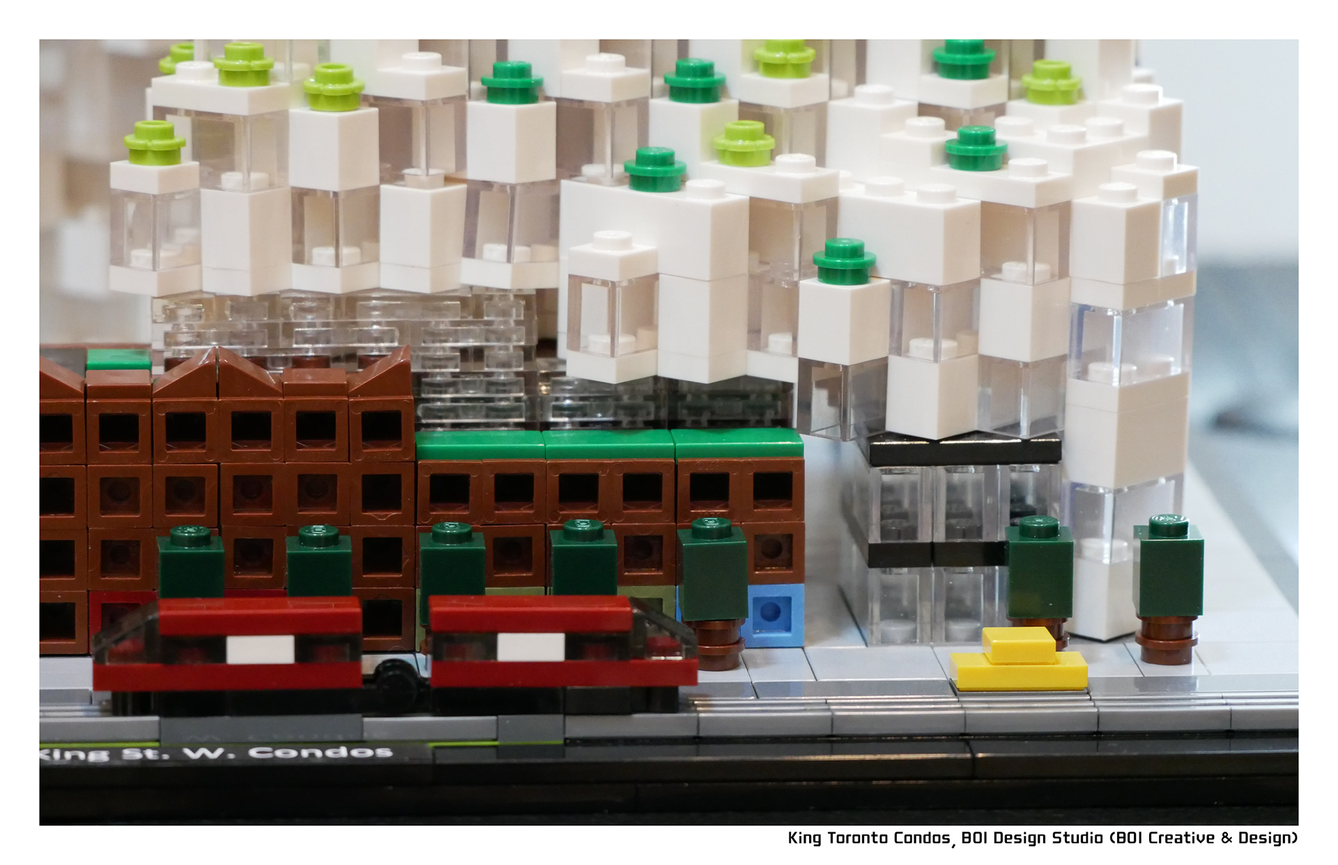 In 2020, BOI Design Team’s LEGO MOC (My Own Creation) model of 285060 King West Street Condos (King Toronto Condos) is a compelling and articulate miniature architectural representation that demonstrates both form literacy and conceptual clarity in a playful medium by BIG (Bjarke Ingels Group). The stepped geometry, even at LEGO scale, communicates ideas of urban porosity, private terraces, and dynamic skyline modulation. Despite the limitations of the LEGO brick system, the designer skillfully uses block texture, color contrast, and modular stacking to express façade articulation, horizontal bands, and spatial variation, effectively conveying architectural hierarchy. The model isn’t just a miniature of a building — it demonstrates a clear understanding of urban context and typology, possibly referencing King West’s evolving condo landscape in Toronto. It reads as a model not just of form, but of function and program, suggesting zones for commercial base levels, stepped mid-rise residences, and rooftop terraces.