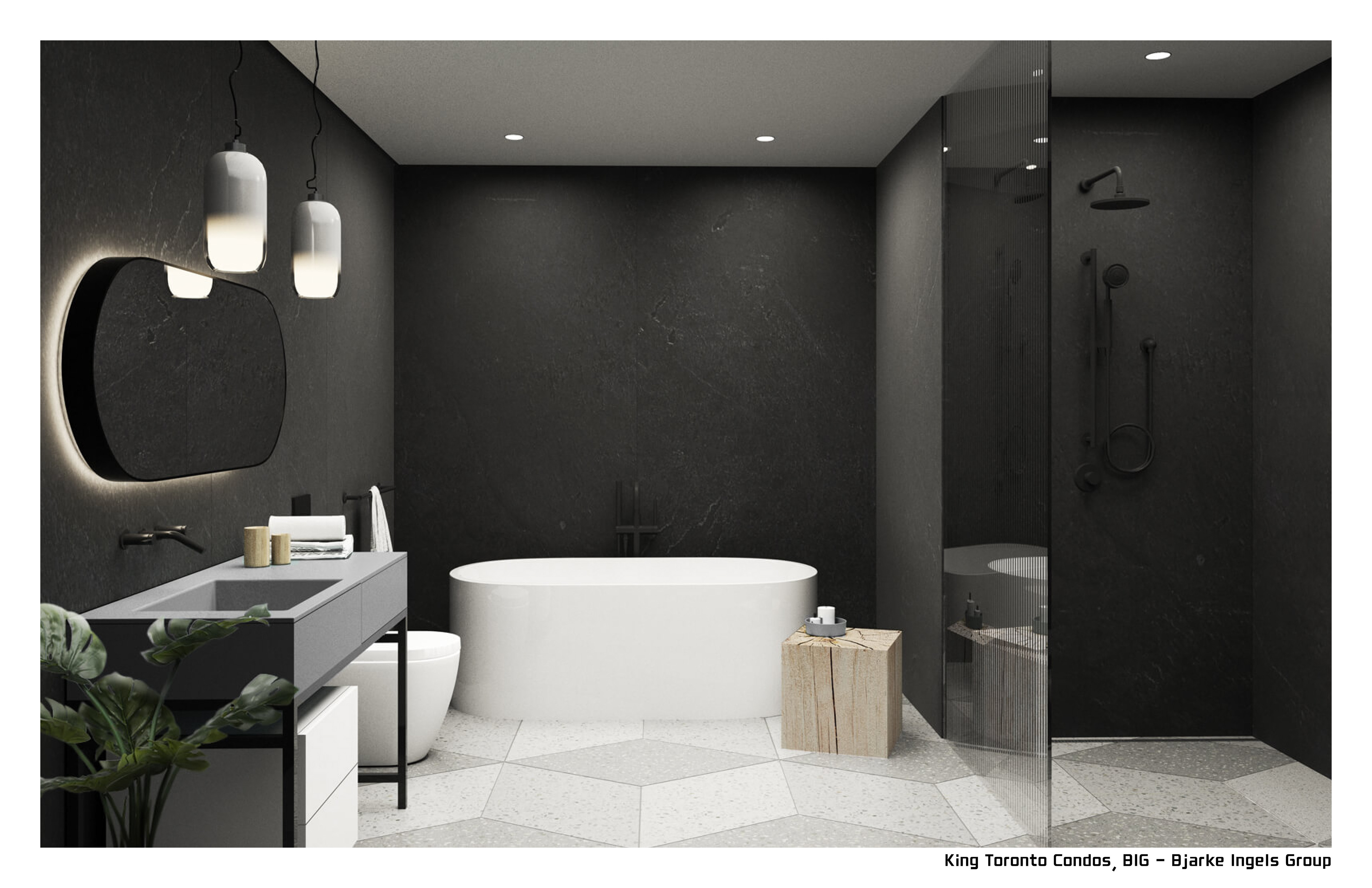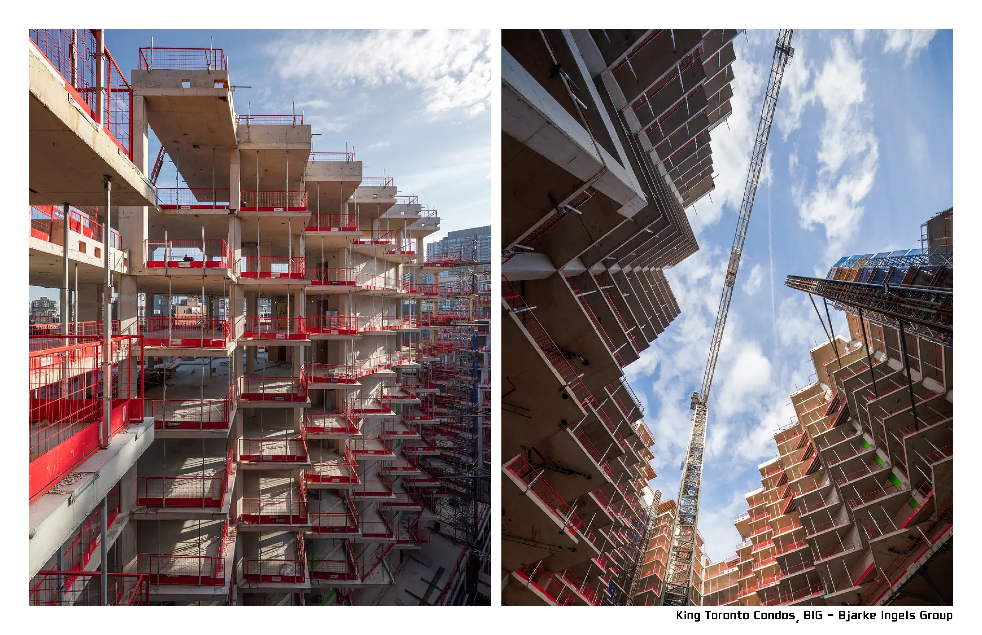BIG's design for King Toronto Condos introduces a distinctive terraced structure that reinterprets the traditional urban block. The building comprises a series of stacked, box-like modules arranged in a pixelated formation, creating a mountainous silhouette that steps back from the street as it rises. This form draws inspiration from Moshe Safdie’s Habitat 67, emphasizing modularity and integration with the urban fabric. The design incorporates green terraces and courtyards, fostering a sense of community and connection to nature within a dense urban environment.